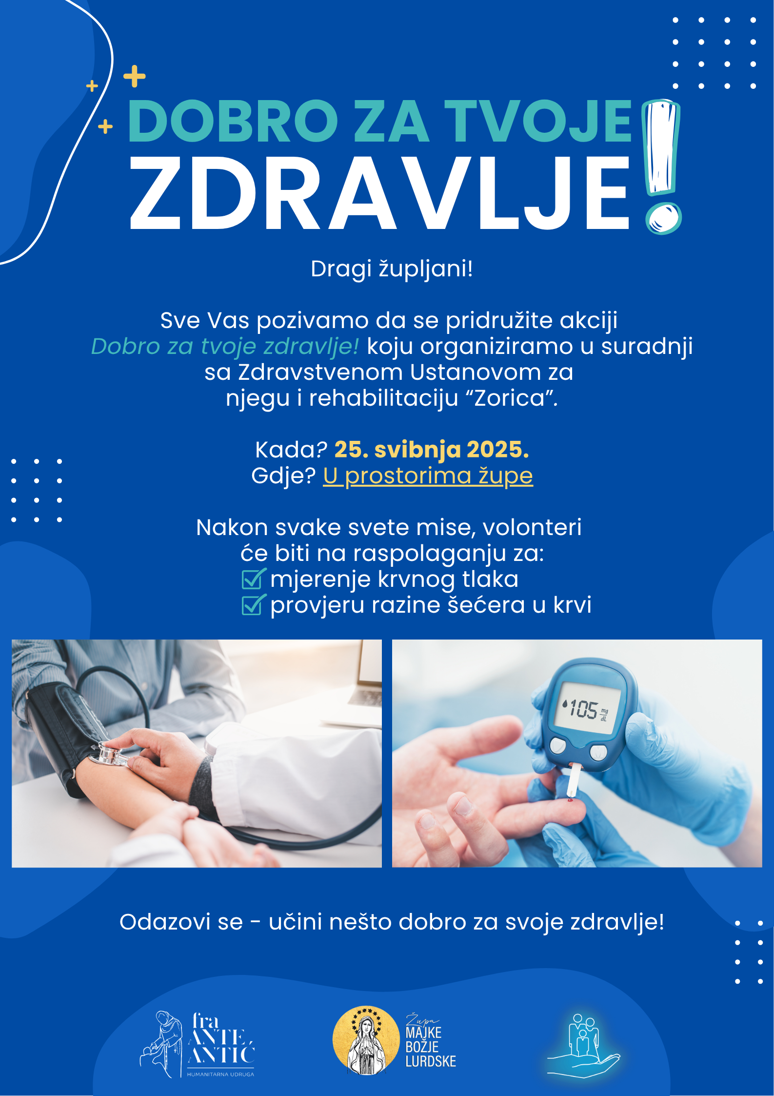 U nedjelju, 25.05., organiziramo akciju u suradnji sa Zdravstvenom ustanovom za njegu i rehabilitaciju "Zorica" i župom Majka Božja Lurdska pod nazivom "Dobro za tvoje zdravlje!".