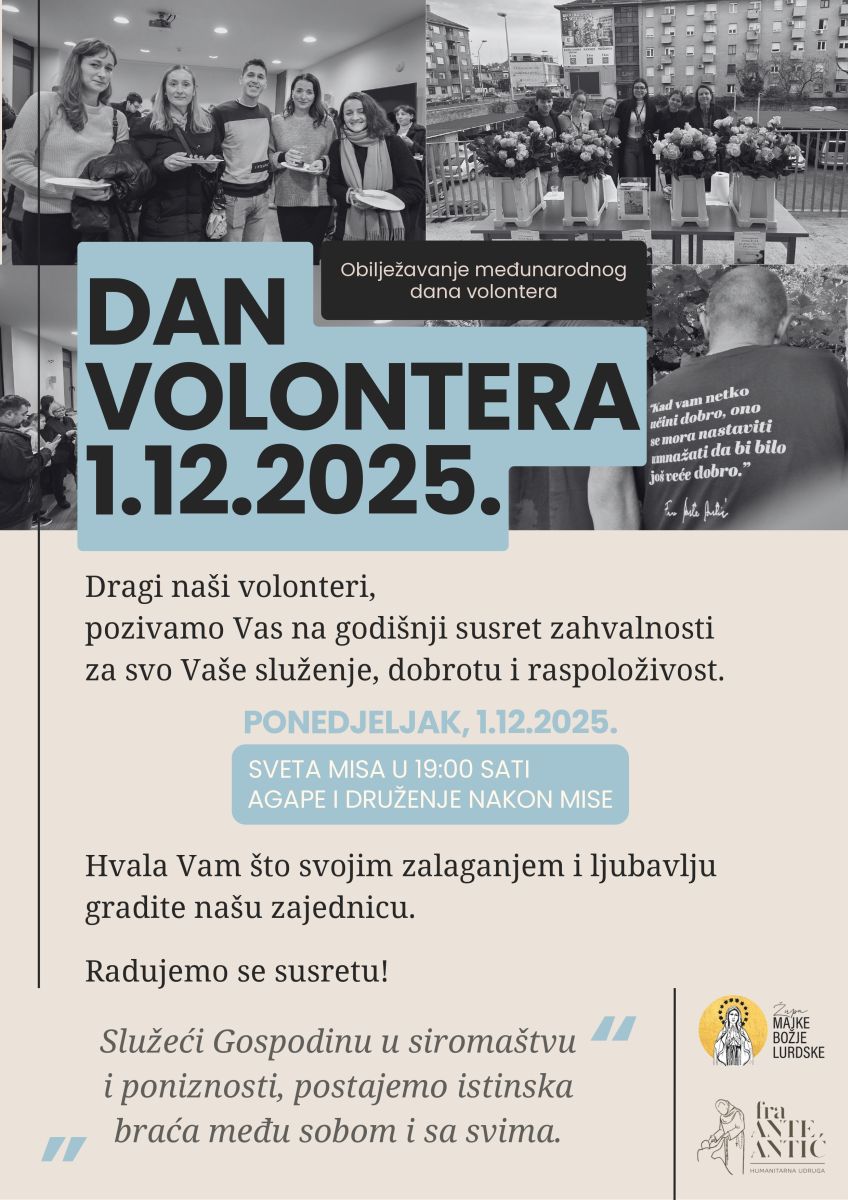 U ponedjeljak 1. prosinca, proslavit ćemo međunarodni dan volontera u našoj župi svetom misom u 19 sati. Nakon mise slijedi agape i druženje u našoj vjeronaučnoj dvorani. Vidimo se u što većem broju!