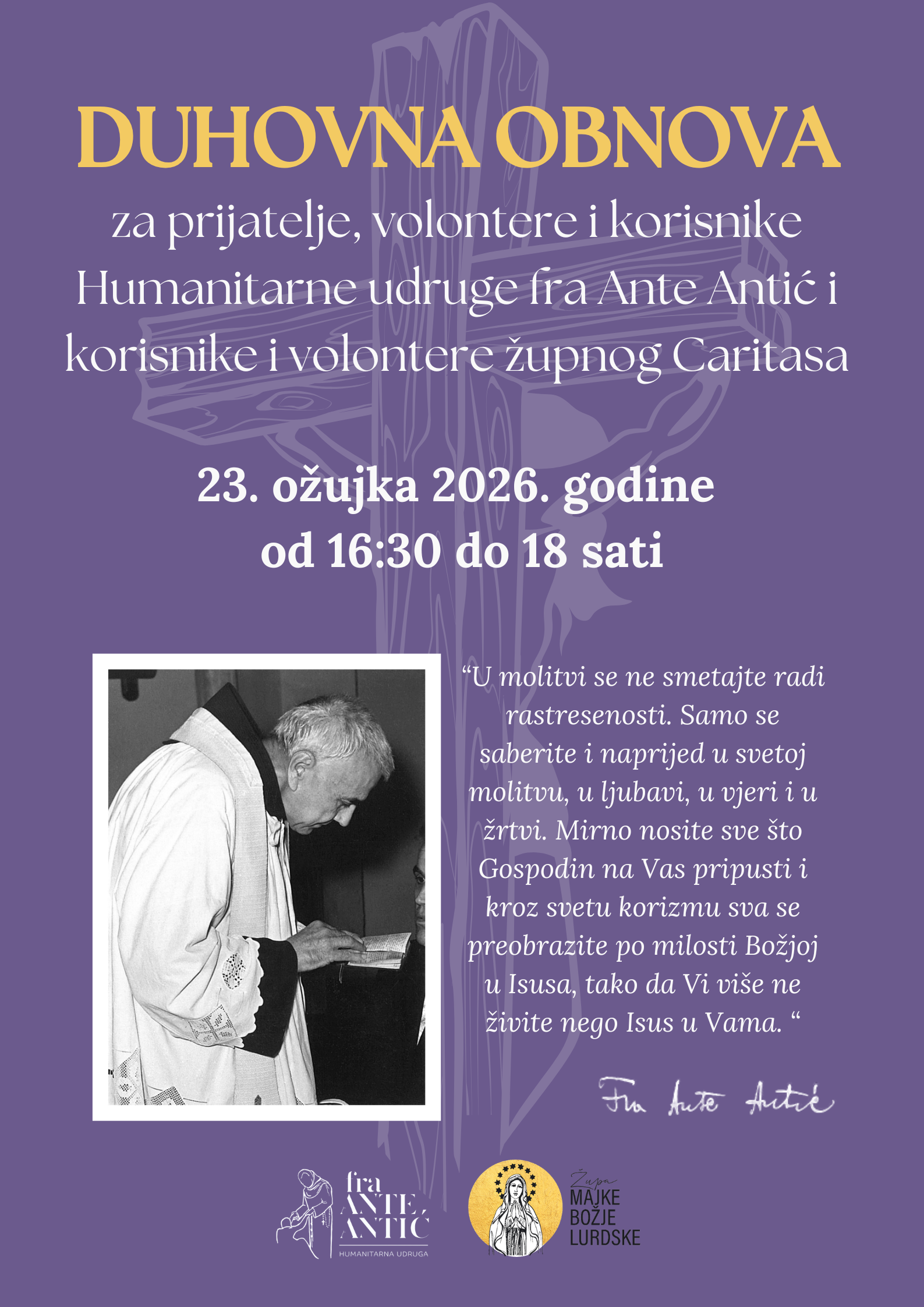 u ponedjeljak, 23. ožujka 2026. od 16:30 do 18:00 sati, održat će se korizmena duhovna obnova za sve prijatelje, volontere i korisnike Humanitarne udruge fra Ante Antić i župnog Caritasa.