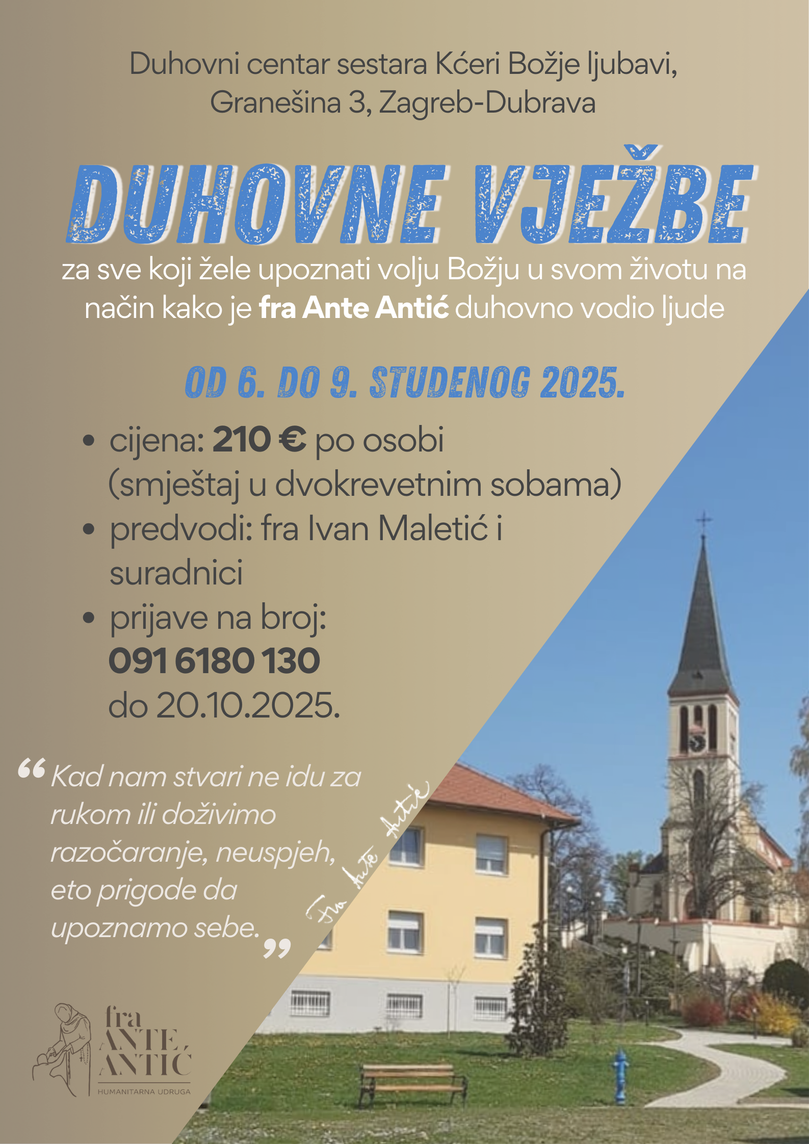 Duhovne vježbe održat će se u Duhovnom centru sestara Kćeri Božje ljubavi u Zagrebačkoj Dubravi, na adresi Granešina 3. Predvodit će ih fra Ivan Maletić i suradnici, a prijavit se možete na broj 091 6180 130 do 20. listopada 2025.